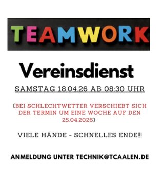 Um die Arbeiten und für Euer leibliches Wohl besser planen zu können, hängt eine Liste im Eingangsbereich Tennishalle (Tür Werkstatt) zum Eintragen für die Arbeitsdienste aus. Alternativ könnt ihr uns auch eine E-Mail an technik@tcaalen.de senden.